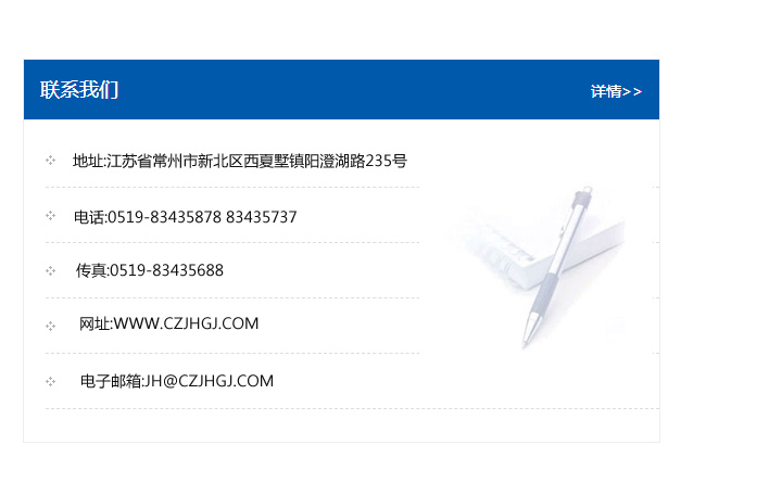 地址:常州市新北區友邦商務大廈1幢16、17層  電話:0519-85101652  傳真:0519-85112595  郵編:213022  網址:www.cz-jiayue_cn.fjsdx.com  郵箱:xiajifengaa@163.com